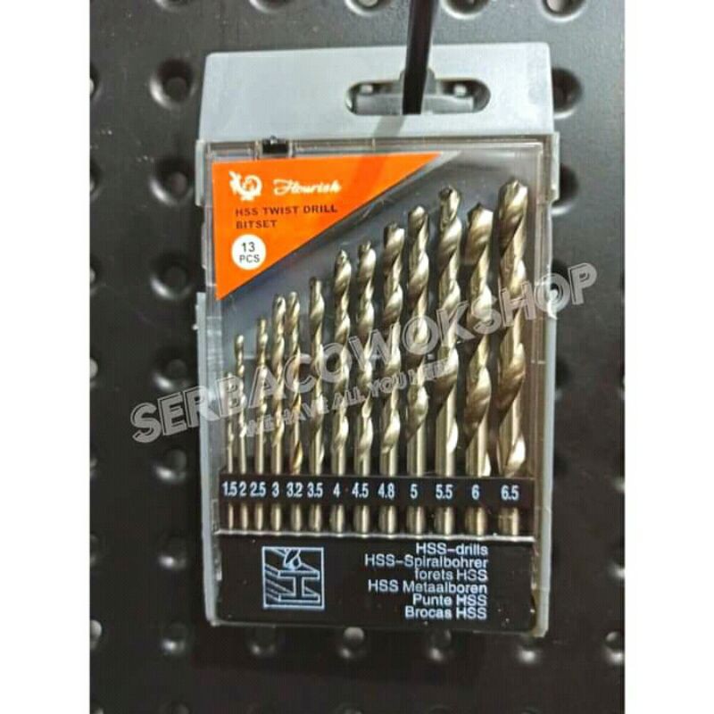 Mata Bor Besi Set 1.5 - 6.5 mm 13 Pcs Mata Bor HSS Twist Drill Bitset Termurah BerkualitasDeskripsi Produk:* Merk Flourish* Jumlah 13 pcs* Ukuran 1.5-6.5 mm* Untuk bor besi ( bisa dipakai di tipe ka