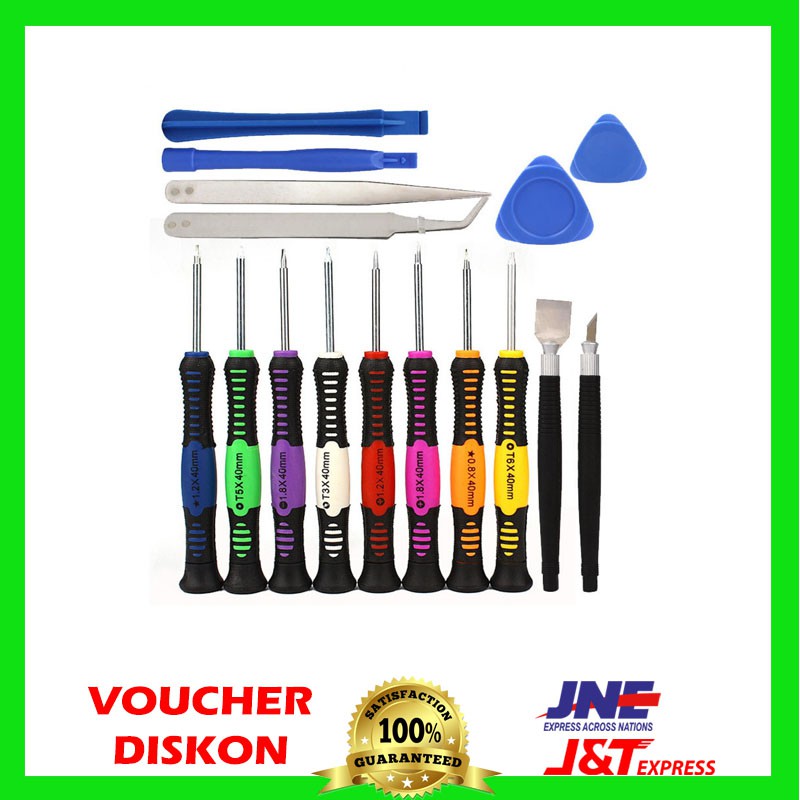 PENGIRIMAN HARI YG SAMA MAKS JAM 16.00, SELEBIHNYA DIKIRIM H+1Informasi Produk POWER Obeng Set 16 in 1 Reparasi Smartphone Handphone - 2811Obeng set dengan berbagai perlengkapan dan mata obeng berbeda yang sangat berguna bagi Anda yang sering mengoprek / membongkar perangkat Smartphone, handphone atau pun gadget komputer lainnya. Tersedia berbagai jenis kepala obeng yang dapat anda sesuaikan dengan kebutuhan anda.Features16 in 1Tersedia beberapa jenis kepala obeng dan juga perlengkapan untuk memudahkan anda membuka perangkat. Semua kebutuhan obeng Anda tersedia dalam satu paket ini. Sangat berguna terutama untuk Anda yang suka mengoprek smartphone, handphone ataupun perangkat elektronik lainnya.Good Quality MaterialProduk ini terbuat dari bahan baja khusus sehingga tidak mudah berkarat dan juga sangat kuat digunakan dalam jangka waktu lama. Untuk beberapa perlengkapan lainnya terbuat dari plastik yang kuat. Tip obeng juga mempunyai fitur magnetik, sehingga skrup pada perangkat akan segera menempel pada obeng setelah terlepas dan anda dapat menyimpan sekrup ke tempat yang mudah untuk di temukan kembali.Anti Slip HandleSeluruh obeng ini memiliki pegangan dengan material anti slip, sehingga anda tidak akan kesulitan pada saat memutar obeng ketika memperbaiki atau membongkar perangkat anda.Package Content1 x T6 Tor x screw driver1 x T5 Tor x screw driver1 x T4 Tor x screw driver1 x 2.0 Straight screw driver1 x 1.5 Cross screw driver1 x 1.2 Cross screw driver1 x 1.2 Star screw driver1 x 0.8 Star screw driver2 x Paddle2 x mount bar1 x straight tweezer1 x curved tweezer1 x Graver1 x ScraperSpesifikasi POWER Obeng Set 16 in 1 Reparasi Smartphone Handphone - 2811Tipe KepalaOben