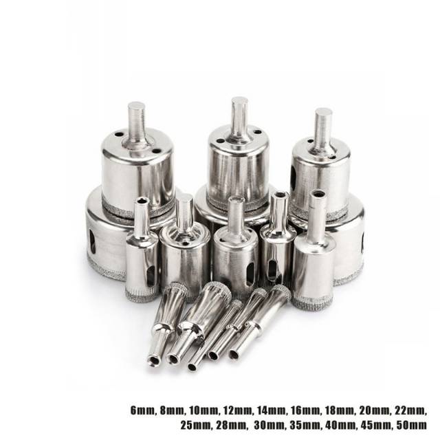 Mata bor ini terbuat dari bahan besi dan dilapisi diamond coated sehingga mata bor ini dapat digunakan untuk melubangi berbagai benda seperti keramik dan kaca. Anda mendapat 16 buah mata bor dengan beberapa ukuran yaitu 6/8/10/12/14/16/18/20/22/25/28/30/35/40/45