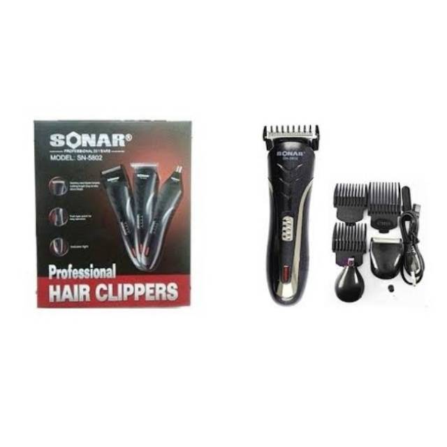SONAR SN 5803 PROFESIONAL CLIPPER CUKUR RAMBUTDengan menggunakan alat ini maka akan sangat memudahkan anda dalam urusan perawaatan rambut pribadi'Selain fungsi sebagai pencukur rambut juga dapat di gunakan untuk mencukur baby dan kumisBaterai kuat tahan lama.Cukuran Sonar SN-5802 :Model 3 in 1Isi 1 paket alat cukur rambut :-Mesin cukur rambut-Minyak-Kabel Charger-Sikat pembersihAda 3 Fungsi :1. Cukur Rambut2. Cukur Bulu Hidung3. Cukur Jeng