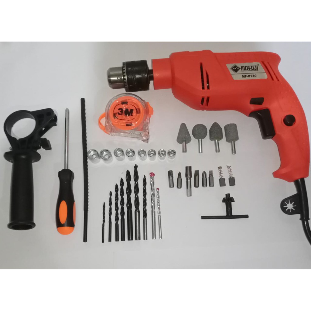 Spesifikasi dan Kelengkapan : Voltase :220 volt/50 HzDaya listrik:550 wattKapasitas bor:13mmSatu koper full set:*Mesin bor mofuji/fujiyama*8 pcs mata socket 6-12mm*5 mata bor besi*2 mata bor kayu*2 mata bor beton*4 pcs gerinda tuner*1unit gagang mesin bor*1unit obeng plus*1pcs meteran [3 M]*2pcs mata obeng plus*2pcs mata obeng minus*buku panduan*Arah pengeboran bisa bolak balik.*Ada mode tembok dan