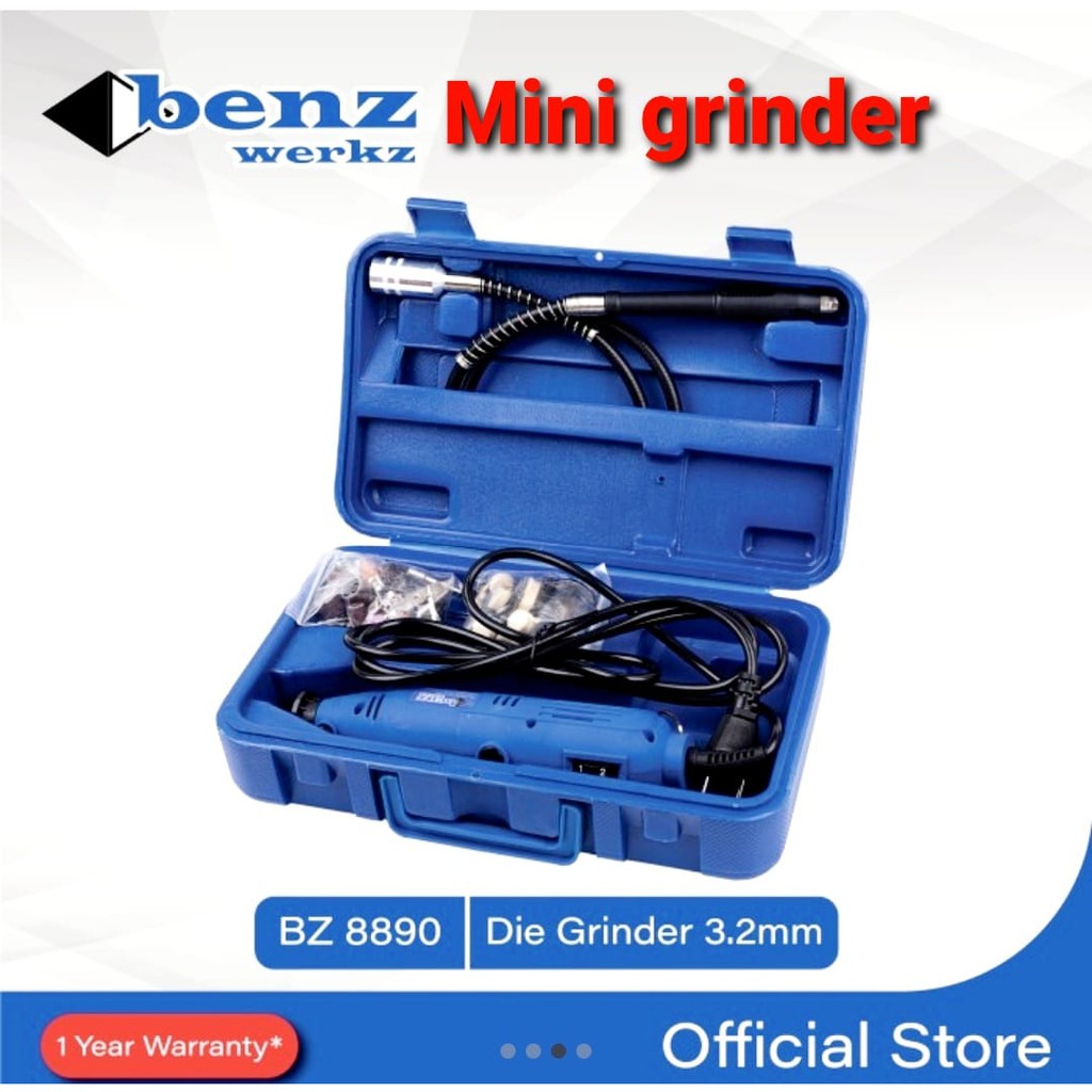iinclude 90 Pcs AccessoriesDie Grinder Set 3,2mm by BENZ WERKZ dengan kualitas produk sangat terjamin dan sangat rapih dengan speed variable yang tinggi.Feature:- Kualitas Benz Werkz dengan harga terjangkau- MULTI FUNGSI- Dapat di gunakan untuk tuning- Untuk pengamplasan- Untuk polishing- Dengan 90 Jenis Aksesoris di dalamnya- Speed bisa diatur sampai dengan 6 percepatan.- Sangat cocok untuk hobby, profesional, dan lain lain.Spesifikasi:- Nama: Die Grinder Set 3,2mm by BENZ WERKZ- Tenaga: 135Watt- Putaran RPM: 8000-35000 MIN- Chuck Dia.: 3mm- Features: 90 Pcs Acc (