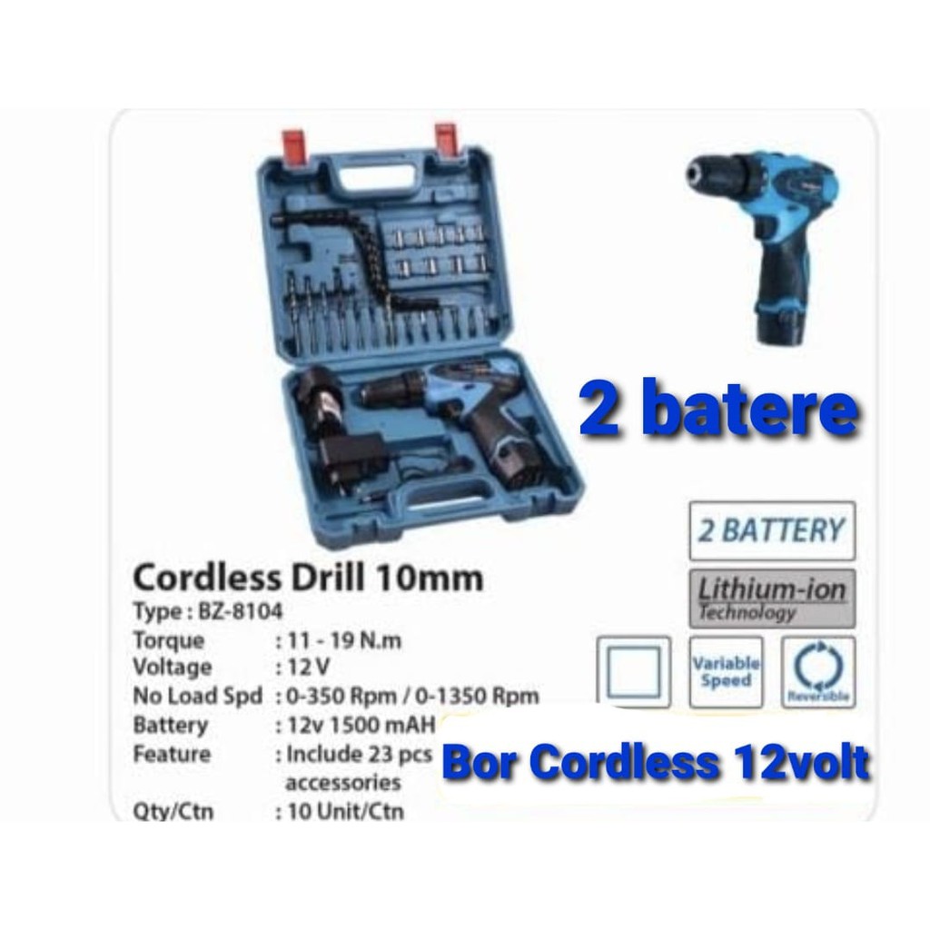 BENZ CORDLESS DRILL 12 VCBD-0104 / BZ-8004 ( Tergantung Stock )Bor baterai dari BENZ dengan 24 Pcs Aksesoris dan 2 Baterai. Barang berkualitas dengan ergonomic design, bisa 2 arah, dan dapat digunakan untuk besi, kayu, dan lain-lain. Tenaga cukup besar 12 Volt (1500mAH). Bor yang berkualitas, sangat praktis, dan mudah dibawa kemana-mana. Sudah memiliki keyless chuck (tidak memakai kunci bor).Spesifikasi:Putaran Tanpa Beban : 0-1350 RPMVoltase : 12 Volt ( 2 Baterai 1500 mAH)Torsi : 11 - 19 NmUkuran Kepala Bor :