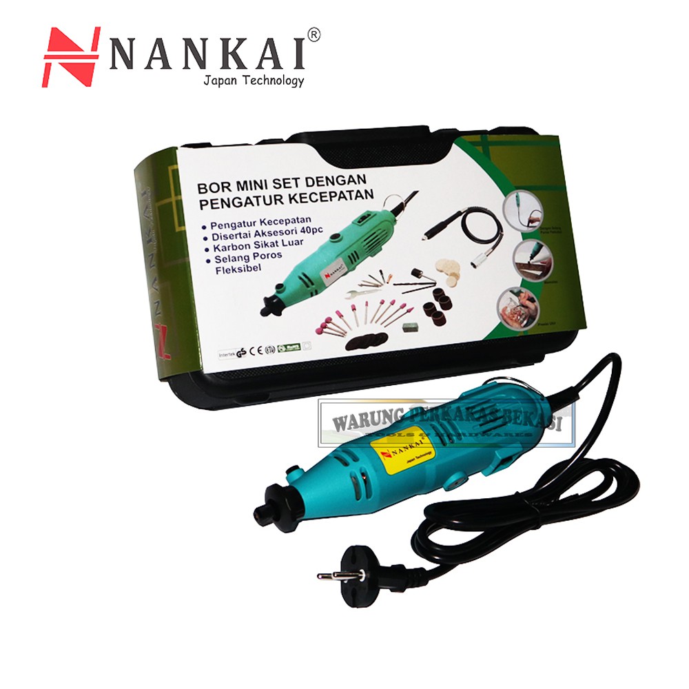 Mini die grinder set 40pcs/mesin gerinda mini/gerinda botol Deskripsi = - VARIABLE SPEED - Voltage : 230V 50Hz - Maximum Output : 135W - No Load Speed Rpm - Collet Chuck Capacity : 3.2mm & 2.5mm - Case Size : 285 x 235 x80 mm - Merk NANKAI Variable Rotary Tool Kit ini di lengkapi dengan Flexible Shaft dan 40 macam Aksesoris kerja. Variable Rotary Tool Kit ini biasa di gunakan untuk memotong, menghaluskan, melubangi dllNankai Japan Technologyset mata 40pcs + flexibleRea