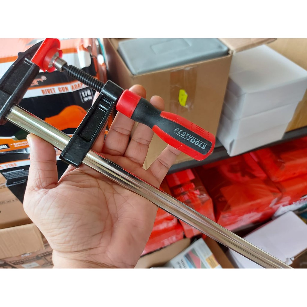 stock terbaru besttools ini motif handle nya seperti pd gambar utamaClamp kayu model F material hardened steel Handle full karet mantap dan nyaman.FeaturesSoft Rubber HandleQuality hardened chrome plated steel (anti karat)Strong clampingspesificationBrand : BesttoolsType : F CLAMPSize : 30cm
