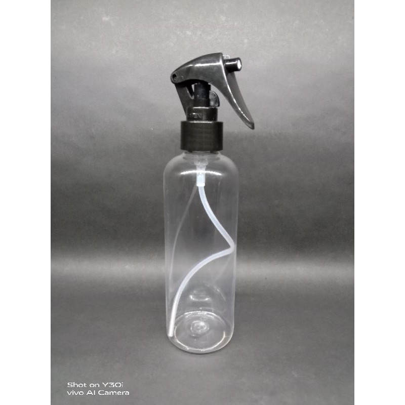 Botol spray 250ml Bening + Triger spray hitamSpesifikasi Botol + TutupTinggi Botol + Tutup : 20cmBahan PET ( Food Grade )Diameter Tutup 2,2cmDiameter Botol 4,6Space Label 11 x 15,8cmKeliling Botol 15,8cmBerat 36
