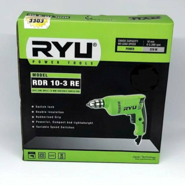 Mesin Bor yang sangat ekonomis dari Tekiro Ryu, ditunjang dengan fitur dan tenaganya yang mempuni. Dilengkapi dengan Switch Lock, Double Insulation dan Rubberised Grip membuat mesin ini menjadi lebih nyaman serta kompak dipakai baik bagi pekerjaan maupun hobby anda.Spesifikasi- Produk berkualitas dari TEKIRO RYU, harga terjangkau- Bor listrik 10 mm untuk pengeboran besi dan kayu- Dapat digunakan sebagai mesin obeng- Mesin bor bolak balik (reversible) dan kecepatan dapat diatur (variable speed)- Cocok untuk kebutuhan rumah tanggaDaya listrik : 370 WUkuran kepala bor : 10 mmKecepatan tanpa beban : 0 - 3.200 RPMDiameter pengeboran pada besi/kayu : 10 mm"TEKIRO CORPORATIONJapan Techno