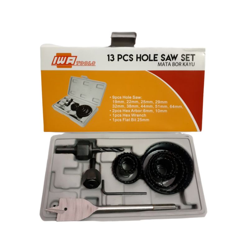 WAJIB BACA YA CALON BUYER KITA KIRIM SESUAI STOK YG ADA YA KAKAKDeskripsi Produk :1 Pc Big Arbor with twist Drill 6x60mm1 Pc Smal Arbor1 Pc Alley Key 2.5mm1 Pc Wood Flat Bit 25mmHole Saws : 19mm, 22mm, 25mm, 29mm, 32mm, 38mm, 44mm, 51mm, 64mmHole Saw Set 13 pcs merupakan aksesoris perkakas yang wajib dimiliki di rumah Anda. Alat ini dapat digunakan untuk membuat lubang pada kayu, paralon, triplek, dan plastik. Alat ini terdiri dari mata bor dengan berbagai macam ukuran dan dikemas dengan kotak plastik dengan mudah disimpan dan dibawa kemana saja.CATATAN :MERK DAN WARNA AKAN KITA KIRIM RANDOM SESUAI STOK YANG ADA YAAASEBELUM KIRIM KITA CEK DAN PASTIKAN BARANG TSB DALAM KEADAAN
